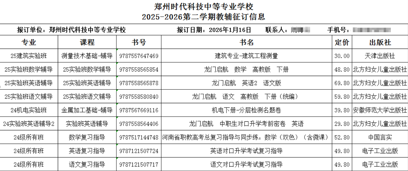 本次教辅材料征订覆盖我校25级建筑实验班、25级实验班(数学/英语/语文辅导)、24级机电实验班、24级实验班(英语辅导2)及24级所有班级学生。